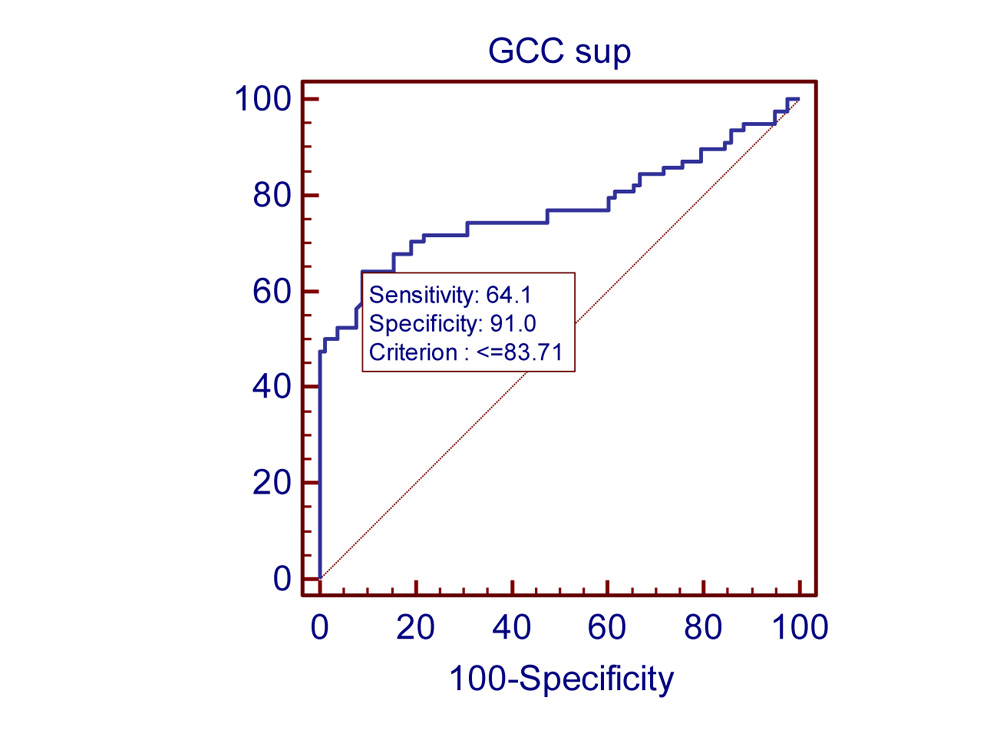 AUC for GCC superior average the area under the ROC (AROC) curve for sup average is .774. 95 % confidence limit is .700- .837. With cut off limit of 83.71, sensitivity is 64.1% specificity is 91.0%.