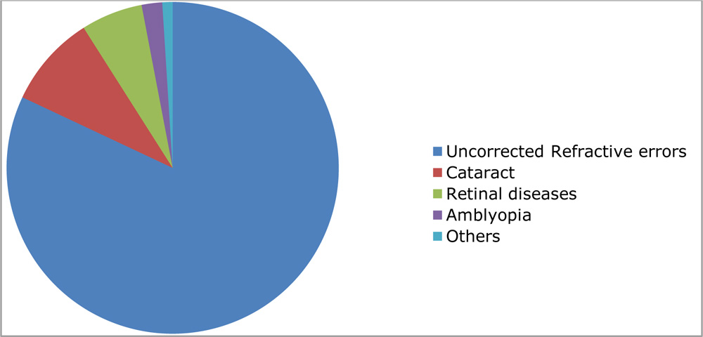 Cataract was the 2nd major cause of decreased visual acuity (9%) PSC 2% nuclear and cortical cataract 7%, followed by retinal problems (6%)-Myopic macular degeneration, diabetic maculopathy, AMD being more common, amblyopia(2%) particularly strabismic  and anisometropic, or other causes (1%, including PCO, corneal opacity etc.)