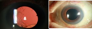 Fig 1.(a)Preoperative- Complete IOL dislocated (b) IOL exchange with Scleral fixated IOL