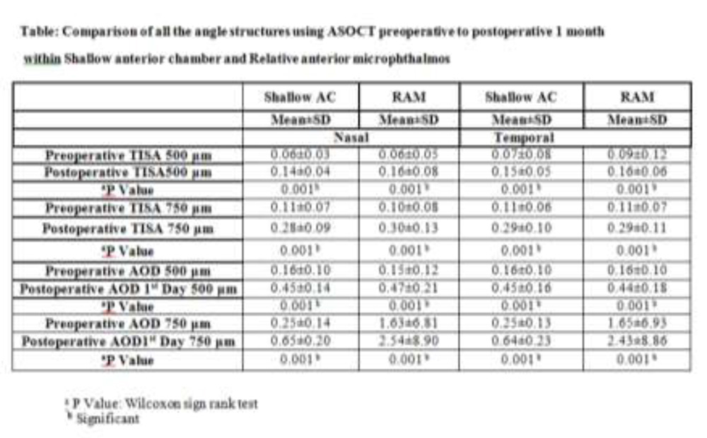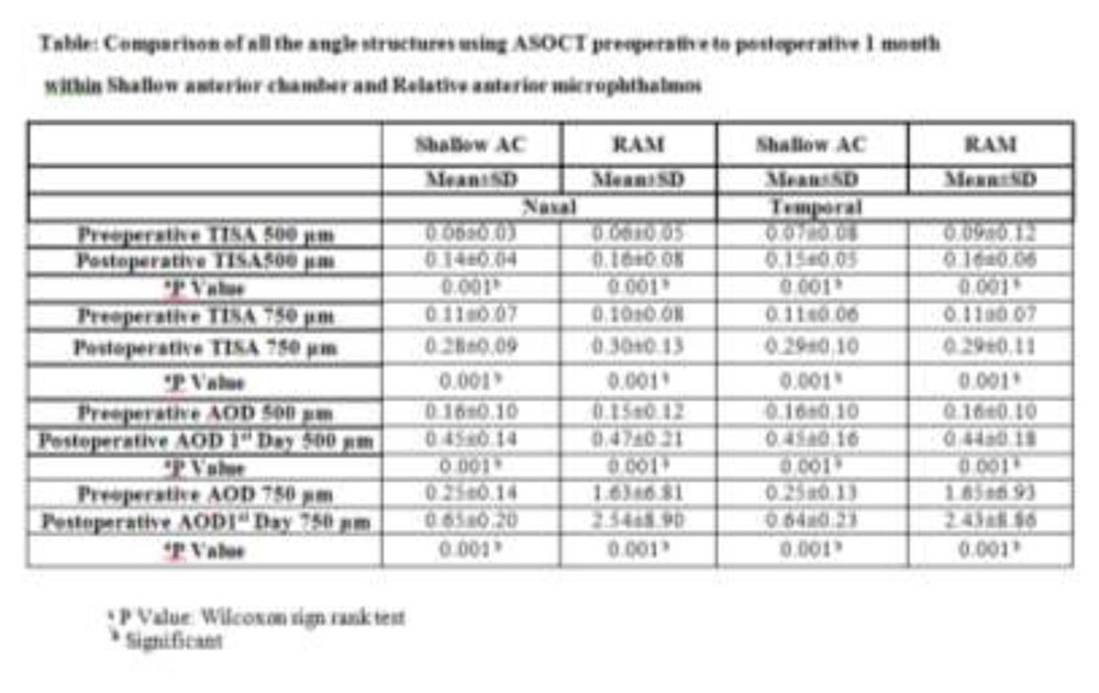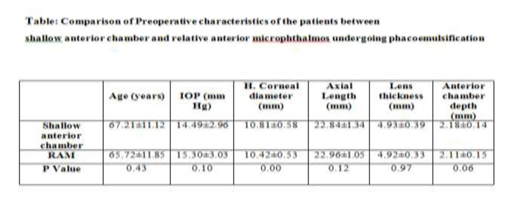An importantlimitation of this study lies in thesample size which we have not calculated.In conclusion relative anterior microphthalmos posed more intraoperative surgical difficulties and early postoperative complications.In eyes with RAM there was an increased anterior segment inflammation and also increase in central corneal thickness at early postoperative period when compared against eyes with shallow anterior chambers. RAM and shallow anterior chamber impacted similar changes in anterior chamber configuration after cataract surgery as measured by AS-OCT at 1 month postoperative. In the present series these results indicate that the role of cataract surgery has undergoneconsiderable evolution and that such procedures are now viable options. With optimal preoperative management, careful selection of the intraocular lens, meticulous surgical technique, and appropriate awareness of the potentialintra- and postoperative complications, cataract surgery can be successfully performed in eyes with shallow anterior chamber with acceptable postoperative results.