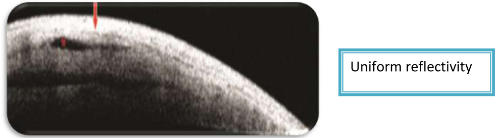 In uniform reflectivity there were no fluid filled hyporeflective spaces in the subconjunctival space. It was seen as smooth, hyperreflective wall.