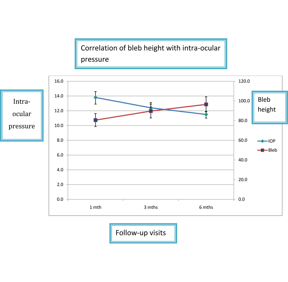 Graph was plotted to shows correlation between bleb height and intra-ocular pressure at 1, 3, 6 months. X axis on left side shows intra-ocular pressure and on right side shows bleb height. Follow-up visits are plotted on Y-axis. A positive correlation between intra-ocular pressure and bleb height was obtained-1µ increase in bleb height leads to 0.02 mmHg reduction in intra-ocular pressure with significant p value of 0.004 and 95% confidence intervals.