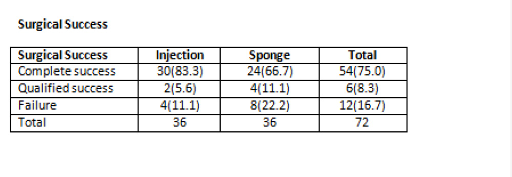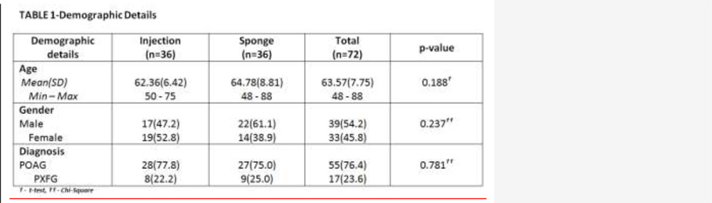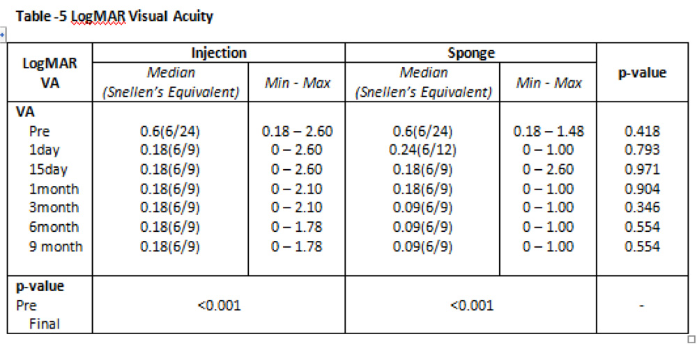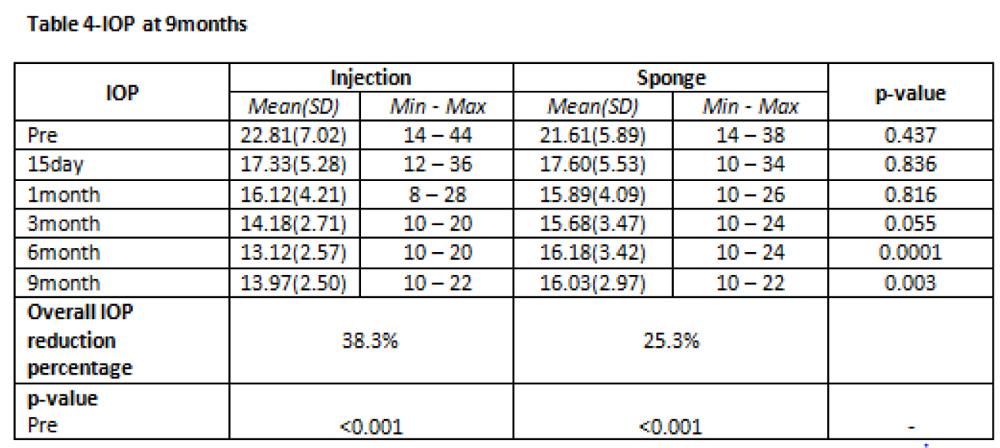 Results-The demographic characteristics were similar in both the groups. Post operatively the IOP was reduced from 22.81(±7.02) to 13.97(±2.50) (p<0.001) in injection group and 21.61(±5.89) to 16.03(±2.97) (p<0.001) in the sponge group. The difference in IOP between the two groups approached statistical significance,(p<.003) with lower IOP in the injection group. 88.9% patients in injection group achieved complete or qualified success at 6 months, and no complications in the injection group were seen . 77.8% of patients had complete or qualified success in sponge group(p<0.001).11.1% of the injection group and 30.6% of the sponge group required one or more anti glaucoma medications post operatively. Post operative vision was similar in both the groups, and improved from baseline (p<0.001). Complications included 2 cases of hyphema and a single case of endophthalmitis,all in sponge group.