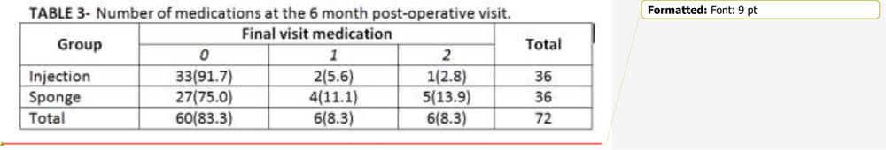 In the sponge application group a fornix based conjunctival flap was created superiorly,and monopolar cautery applied as needed.The MMC soaked sponges (2 poly vinyl alcohol sponges measuring 0.5mm × 0.5mm) were placed on bare sclera covered by tenons and conjunctiva. After 2minutes the sponges were removed and the area was irrigated with 20 ml BSS to wash off the residual MMC. The remainder of the surgical procedure was the same in both groups.