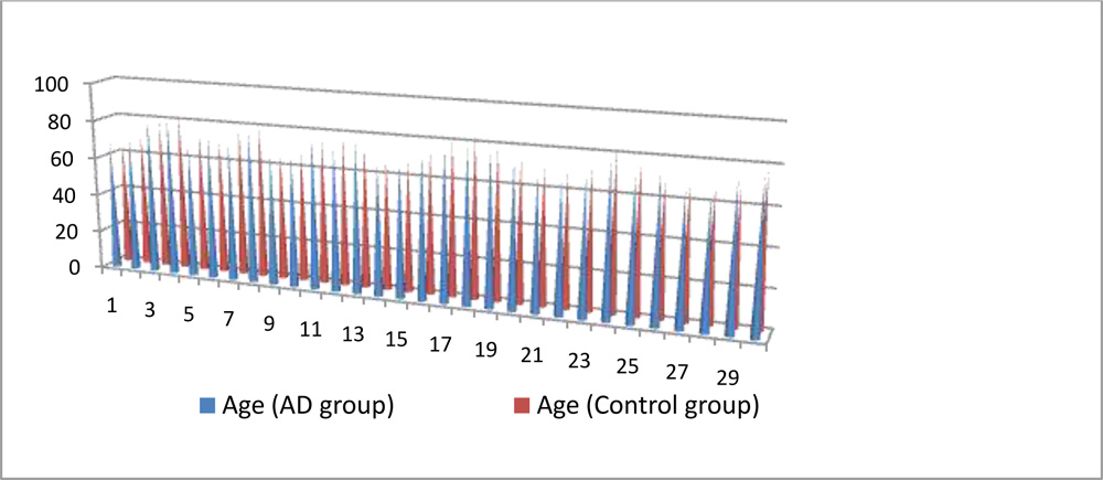 This is a prospective study which included right eyes of 30 diagnosed cases of AD, meeting the inclusion criteria in the age group of 67-83 years, in the time period of April 2015- March 2016. The diagnosis of AD was made on basis of MRI findings and mini-mental state examination (MMSE). The control group consisted of right eyes of 30 patients visiting the outdoor for routine eye examination, mainly for refractive errors.