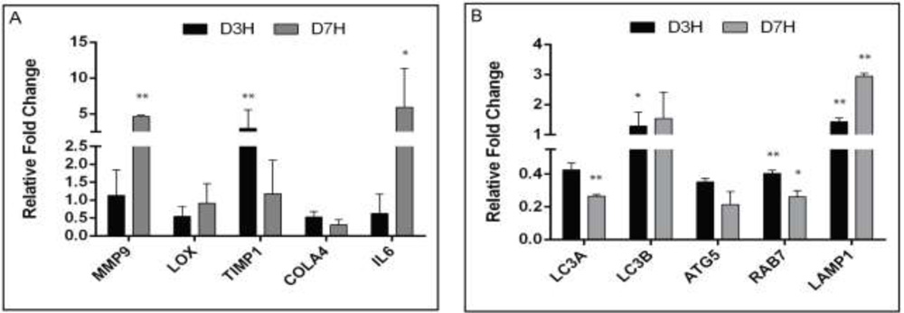 Results: The expression of autophagy signaling pathway related genes LC3A, LC3B, ATG5, ATG7, RAB7 and LAMP1in clinical grades (I to III) of KC patients’ epithelium along with the inflammatory mediators, collagen and lysyl oxidase (LOX) . The mRNA transcript and protein level expressions of the cone (ectatic) and peripheral (non-ectatic) regions in KC and control (PRK) corneal epithelium were compared and are shown in figure below.