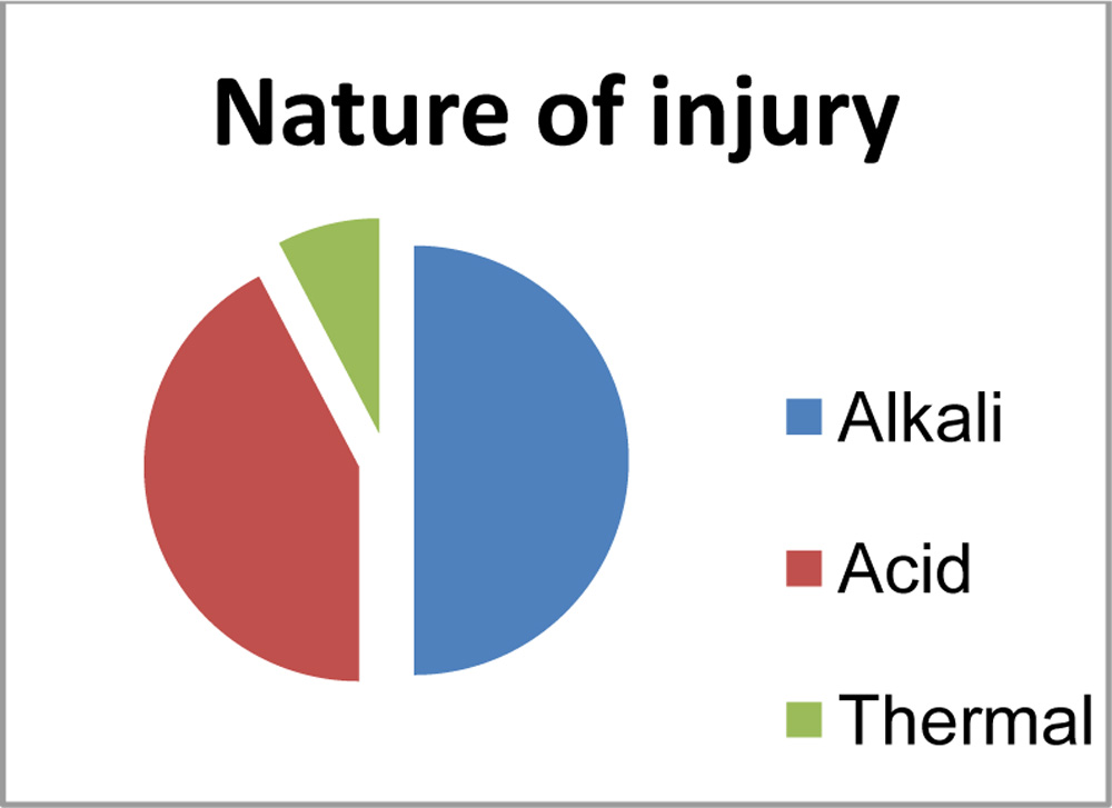 - Of the 4 bilateral injuries, 2 (50%)were due to acids and 2 (50%) due to alkalis.