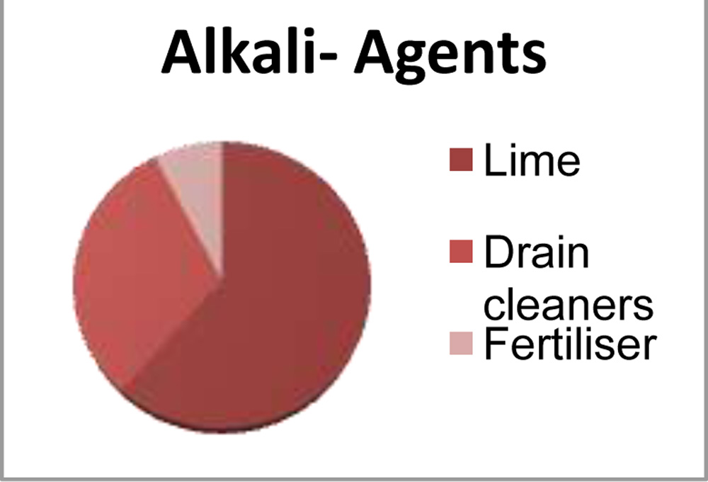 Around 50% were alkali injuries due to following agents: