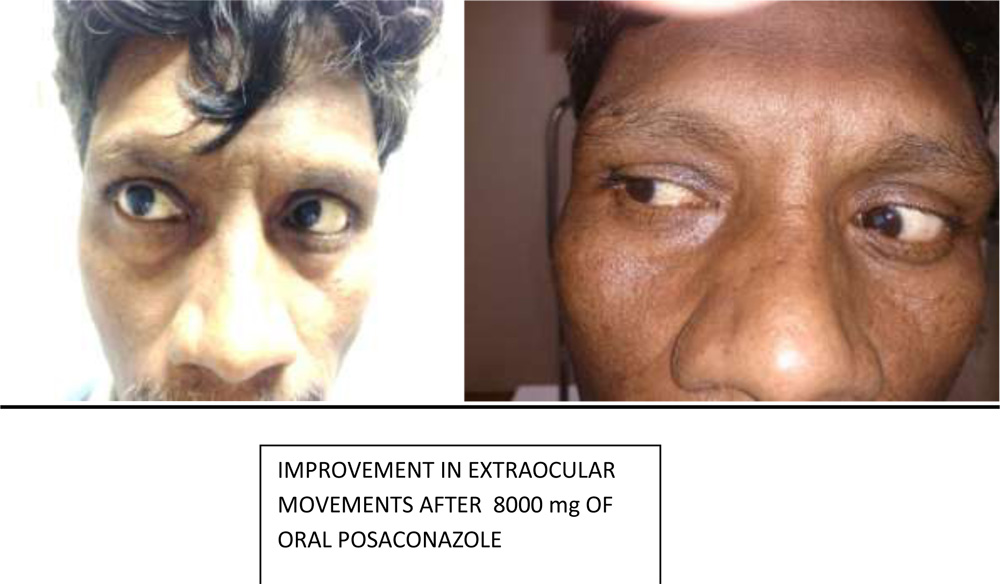 We found out that 4 of our patients who were not responding to amphotericin B, showed improvement in both orbital signs and vision after the administration of oral posaconazole. All 4 received a cumulative dose of >8000 mg of posaconazole. One patient who received inadequate posaconazole therapyof 1800 mg showed no improvement.