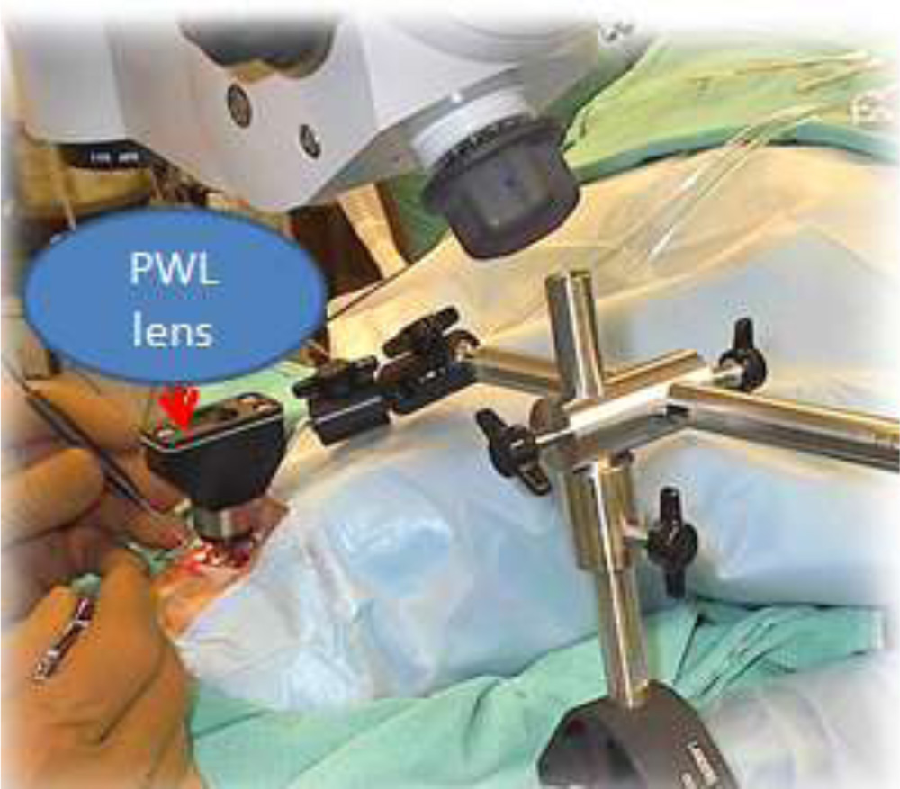 Each viewing system has advantages and disadvantages. PWL lens provides wide-field upright images without an inverter while the 132D lens requires the inverter. The PWL lens and 132 D lenses were originally designed in such a way that they are attached to the wrist rest of the operating table using standard clamp, straight rods, and linkage system. This is independent of the microscope. (Figure 1) This arrangement has the advantage that the focus can be adjusted with the footswitch of the microscope; however one needs to readjust the lens arrangement to maintain the view and centring i.e appropriate XYZ position. This drawback is the main reason as to why this lens system is not commonly used although it is less expensive than other noncontact lens systems.