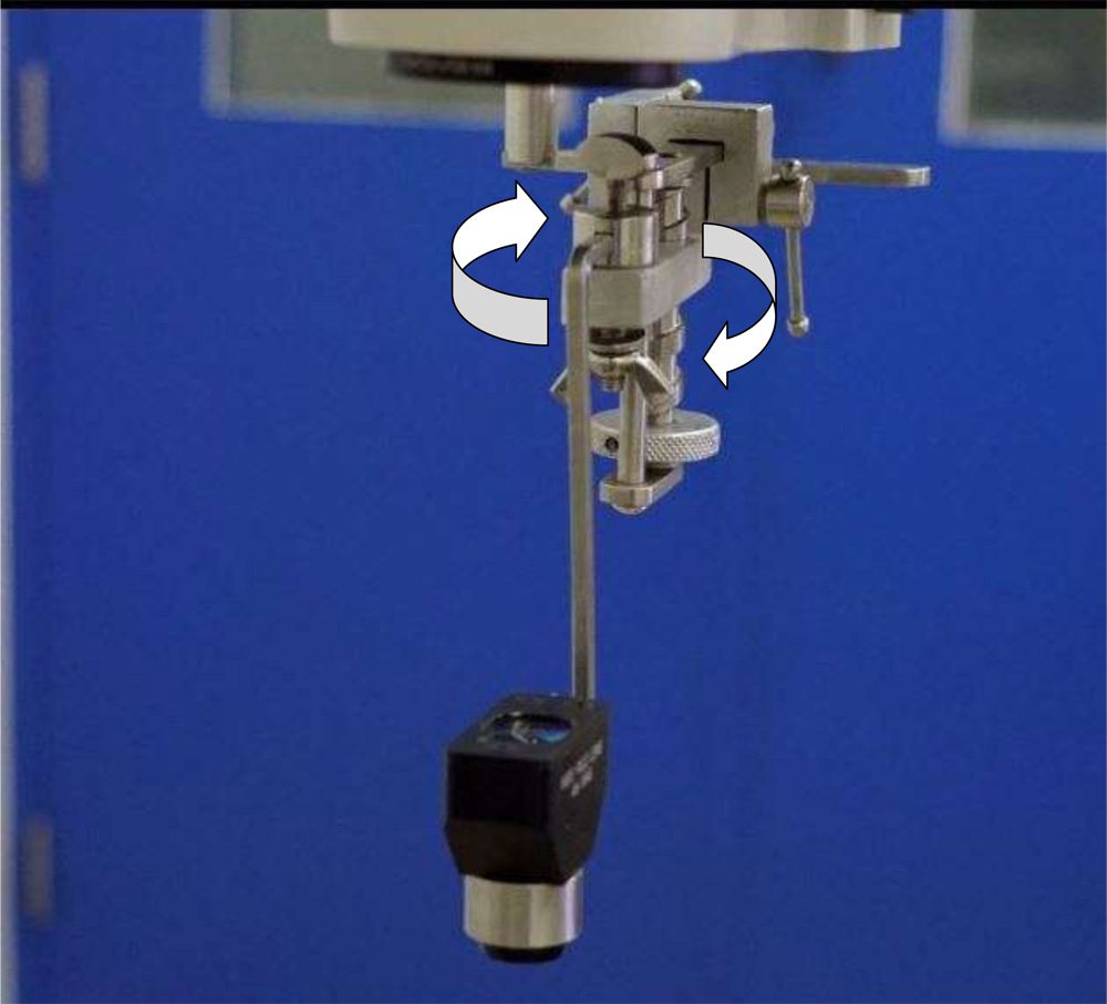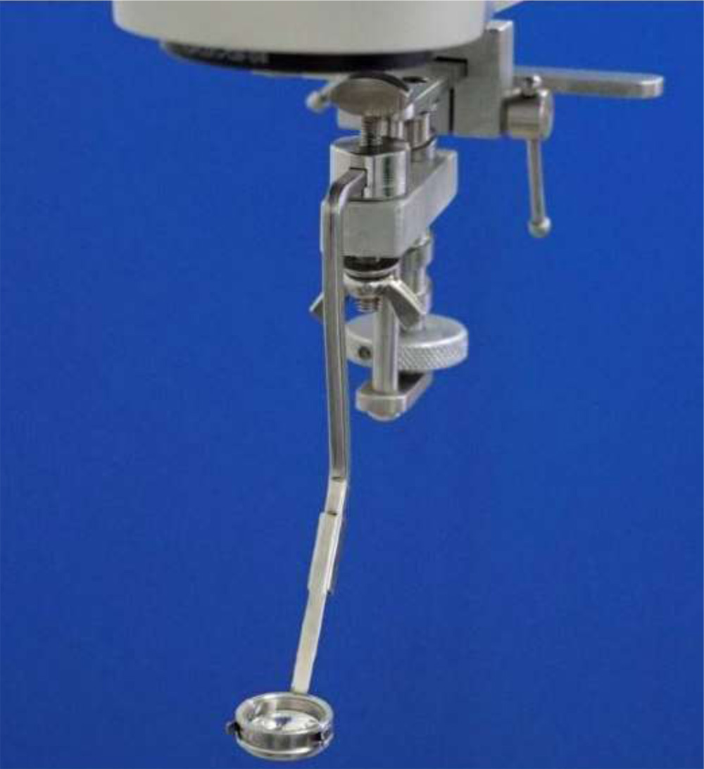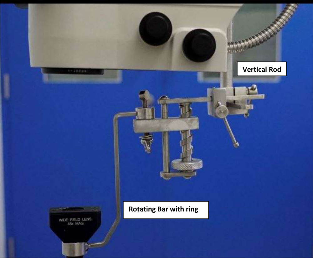 The ring at the lower end holds the PWL lens and the bar can be rotated 210 degrees, this allows for swivelling the lens into position during surgery and can be swivelled out when not in use (Figure 3). This arrangement is in turn attached to a screw based rotational system which translates into up and down movement for the rotating bar carrying the lens. This vertical movement helps to adjust the distance between the lens and the corneal surface during surgery. Closer the lens is to the cornea larger the field of view. The height can be adjusted to 1mm precision. The lens holder can be steam sterilised for surgery