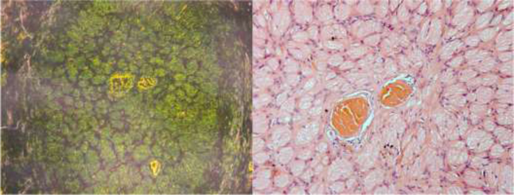 Figure 1: Transverse slice of optic nerve in diffraction and H&E Stain (20x, 40 x)