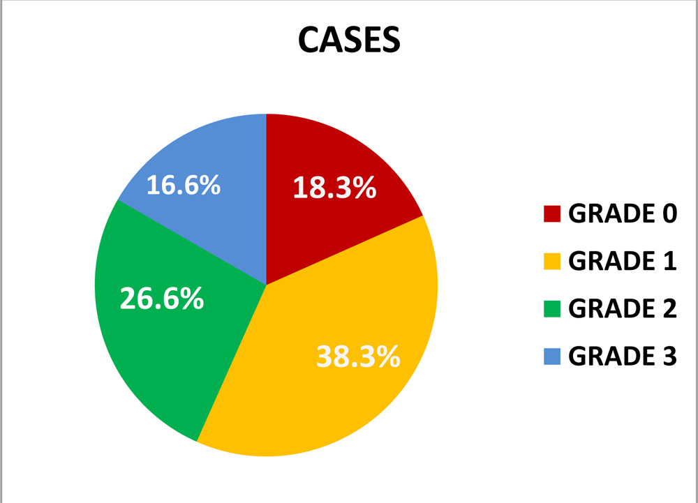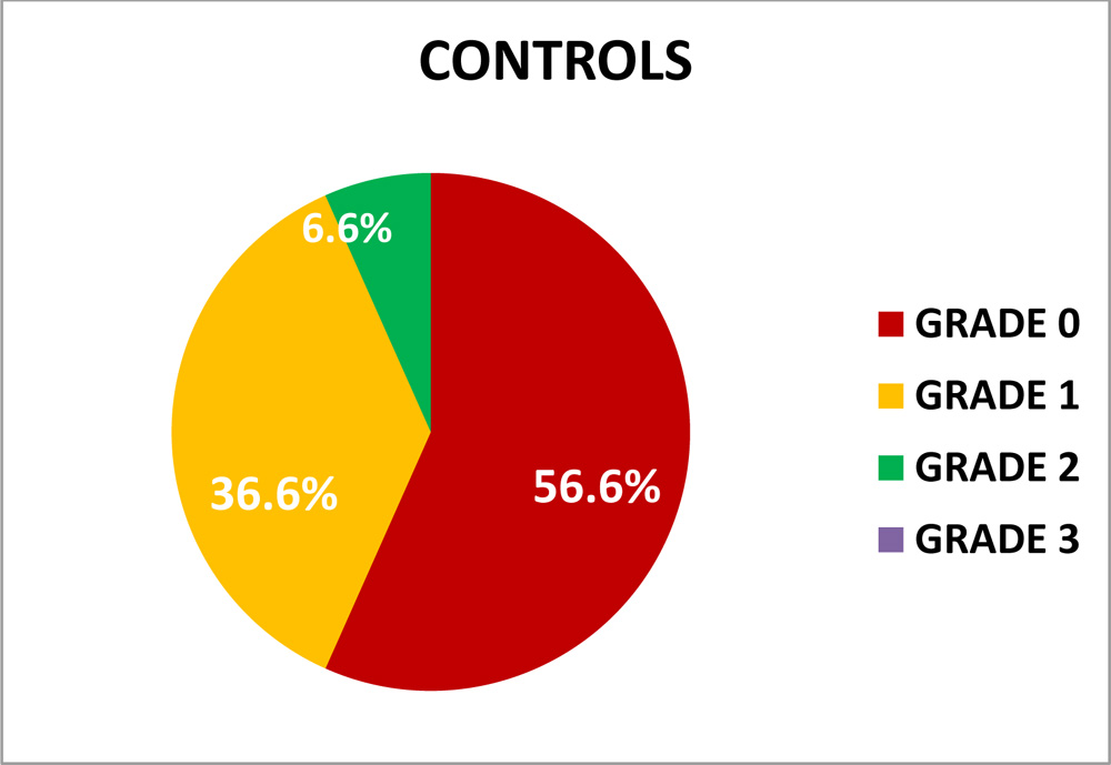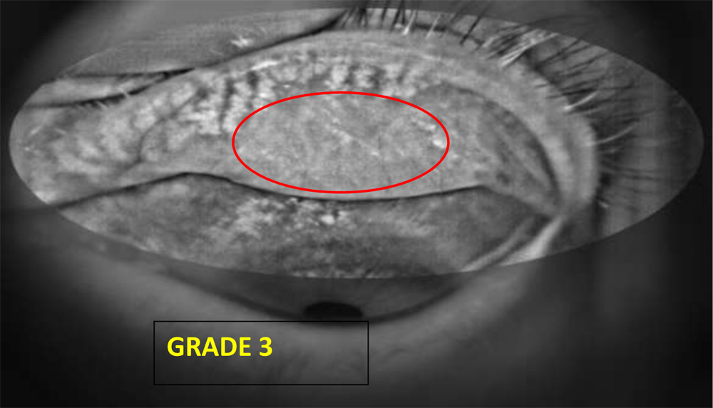 Meibography picked up many subjects with meibomian gland dysfunction among both cases and controls, which were further graded from grades 1-3, based on severity of meibomian gland dropout, and we obtained a p=0.004.