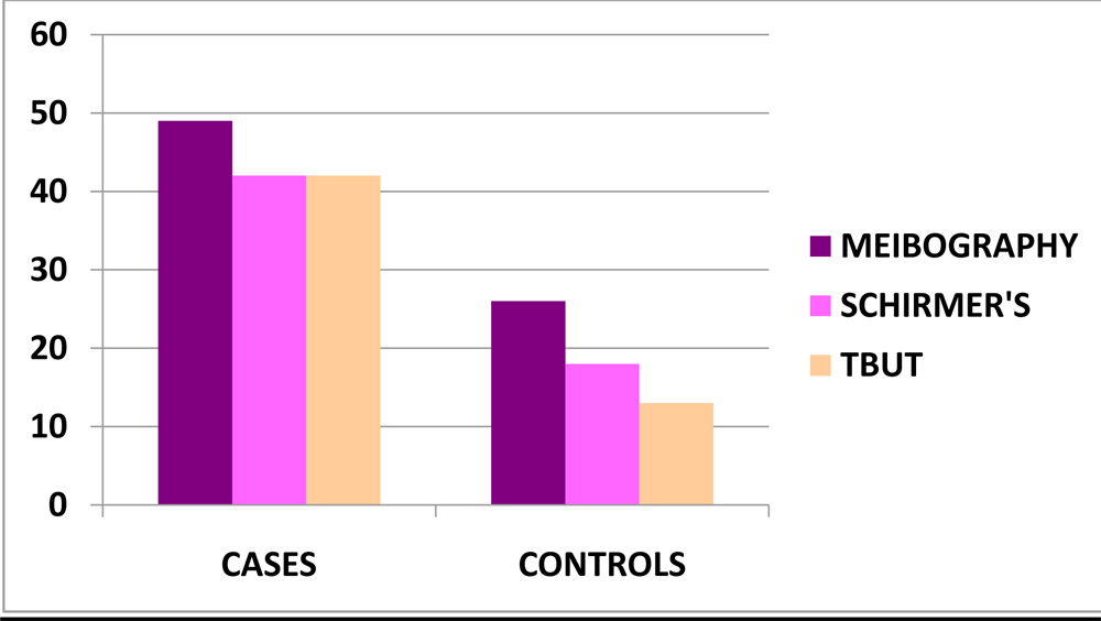 Among 60 controls, meibography picked up 8 dry eye subjects more than schirmer’s and 13 more than TBUT.