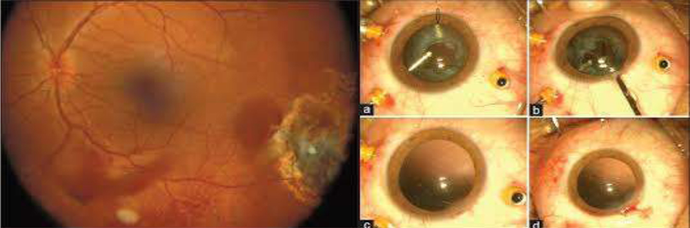 • The surgical technique was a standard three port pars plana approach with simultaneous pars planalensectomy or phacoemulsification when  considered necessary. IOFB was removed by forceps or an intraocular magnet. We used  liquid perfluorocarbon intraoperatively and sulfur hexafluoride (SF6) or silicone oil, as  intraocular tamponade, if required. Endolaser photocoagulation of the breaks and 360°photocoagulation of the retinal periphery were performed.