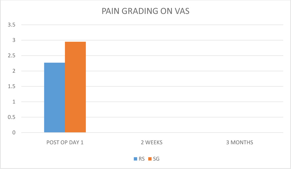 A total of 197 eyes of 197 patients underwent primary pterygium excision with conjunctival autograft secured by either of the two methods.The demographic profile of all patients is mentioned in Table 1. Both the groups were comparable in terms of demographic profile.The mean age of patient was 39.65±11.85 years and 47.36±13.84 years in RS and SG group respectively. Considering laterality, primary pterygium was present in the right eye in majority of patients included in the study. Most of the patients were of Tan’s Grade 2 primary pterygium (60% in RS group and 68% in SG group) while 40% patients were of Tan’s Grade 1 in RS group and 29% patients were of Tan’s Grade 3 in SG group. The mean surgery duration in RS group was 4.84 ±1.34 minutes with minimum of 3 minutes and maximum of 10 minutes.In SG group, the mean duration of surgery was 6.05±3.26 minutes.The pain grading on VAS from first post-operative day until 3months follow-up is shown in Table 2.In RS group, 36%patients complained of pain of scale 2 following release of suture on first post-operative day while in SG group, 44%patients had a pain scale of grade 2.Atthe 2 week follow-up visit,the pain had subsided completely in 92% of patients of RS group and in all patients of SG group. The epithelial defect was healed in all patients at second follow- up visit at 2 weeks. The preand post-operative BCVA at each visit in both the groups is shown in Table 3. In RS group, the mean BCVA before surgery was 0.27±0.41 SD which improved to 0.16±0.28 SD at 2 weeks until the last follow-up visit. In SG group, the mean pre-operative BCVA was 0.22±0.33SD which improved to 0.16± 0.22 SD during all the follow-up visits till 1 year. In both the groups, the autograft was well adhered to scleral bed at each follow-up visit with no events of complete or partial graft retraction. No intraoperative complication occurred in any patient with no serious complication post-operatively requiring any second intervention. In none of the patient, there was any sign of recurrence. All the patients strictly completed 1 year of follow-up to be eligible for inclusion in the present study.