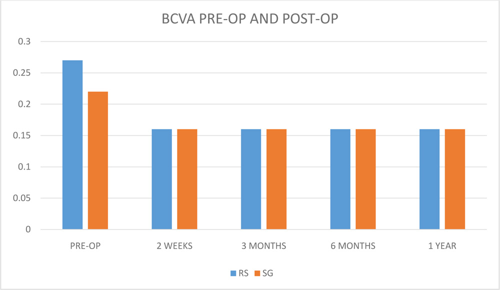 FIGURE 3: DISTRIBUTION OF BEST CORRECTED VISUAL ACUITY (BCVA) BEFORE AND AFTER PTERYGIUM SURGERY ( RS – RELEASABLE SUTURE GROUP , SG – SUTURELESS GLUEFREE GROUP )