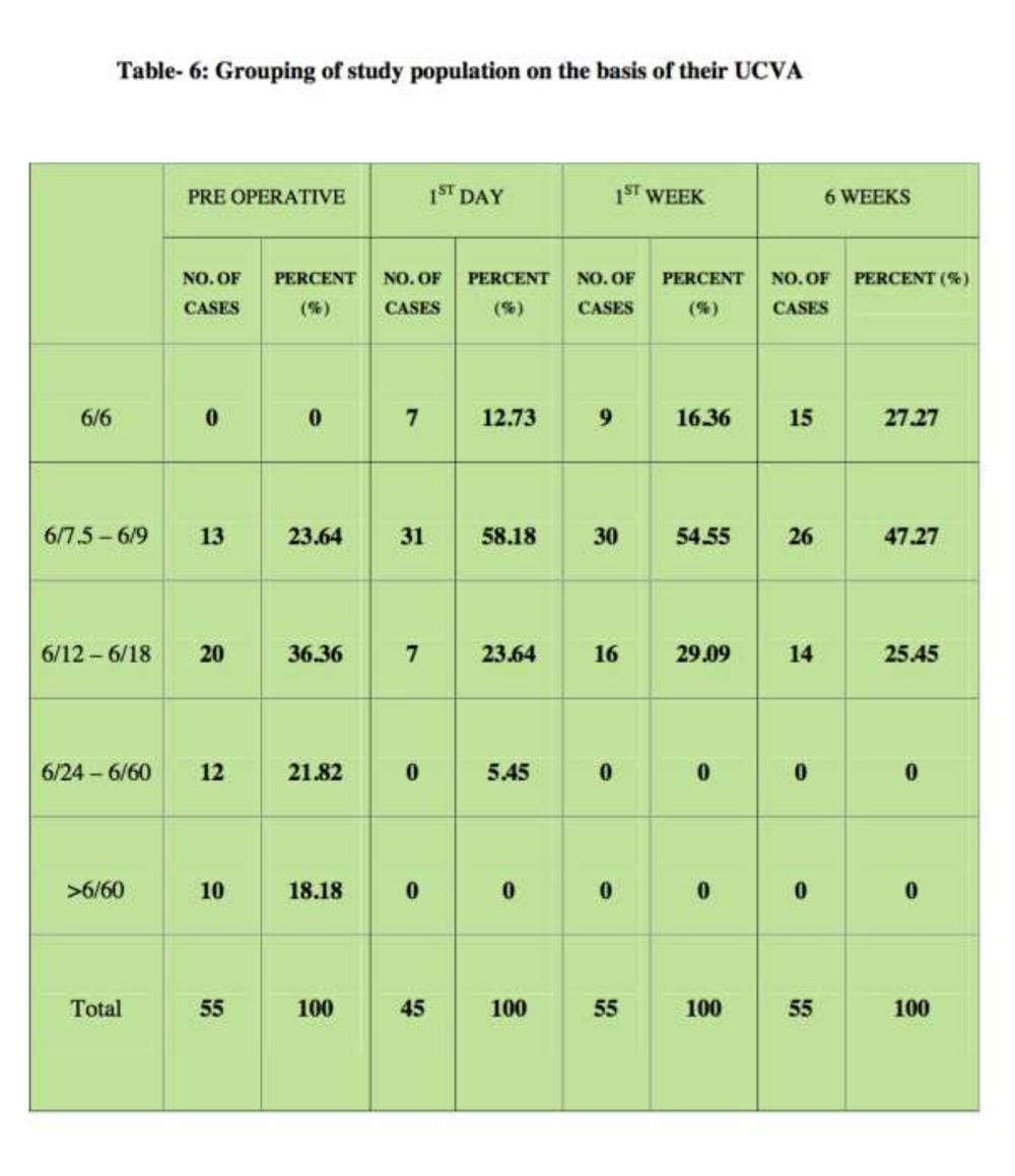 Thus significant number of eyes (50), were found with a post-operative BCVA of 6/6 when compared to 13 eyes pre-operatively. The BCVA was seen to improve progressively with no one <6/7.5at 6 weeks.