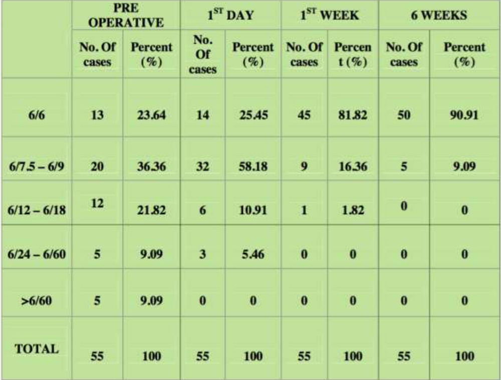 Pre-operatively, 13 eyes (23.64%) had a BCVA of 6/6, 20 eyes (36.36%) 6/7.5-6/9; 12eyes (21.82%) between 6/12- 6/18; 5 eyes(9.09%) between 6/24- 6/60 and 5 (9.09%) less than 6/6. At six weeks, 90.91% ( 50 eyes) had a BCVA of 6/6 and the remaining 5 eyes had 6/7.5 pre-operatively. The BCVA was seen to improve progressively with each visit, with no one <6/7.5 at 6 weeks. The mean value of pre-operative BCVA was 0.27 ± 0.34 which reduced to 0.01 ± 0.03 at 6 weeks (represented in logMAR).Thus, there was a statistically significant improvement in post operative BVCA when compared to the pre operative values.(p<0.05)