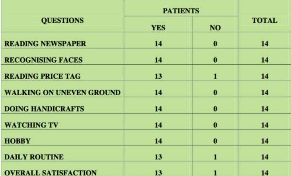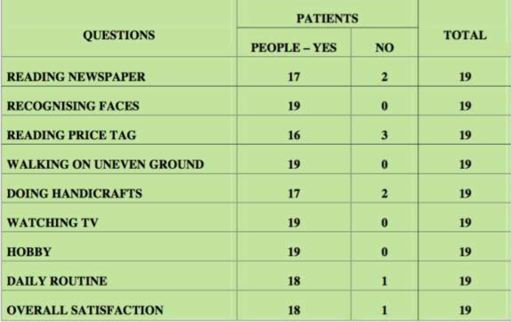 The overall satisfaction of the participants was assessed through a quality of life questionnaire (at 6weeks follow up visit)