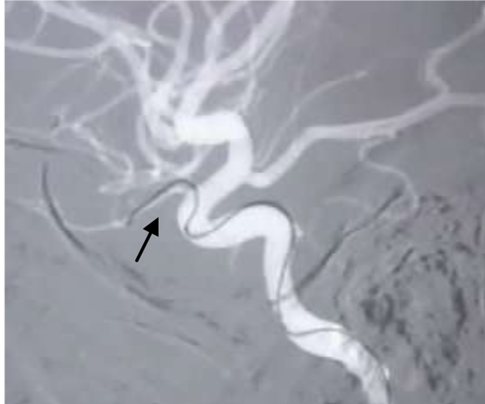 Figure 1. Selective catheterization of the ophthalmic artery (arrow) in a two year old child with retinoblastoma.