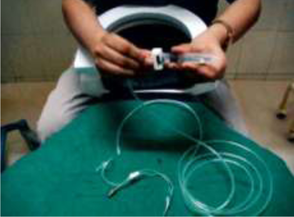 { VISCO FILLED SYRING CONNECTED TO SOI TUBING }