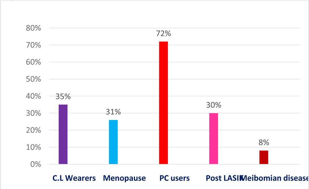 A prospective study performed on 460 patients visited the clinic with the complaints of dry eye. Depends on the structured questionnaire related to the predisposing factors, they are classified into 5 groups (Fig.1). Group 1 Post LASIK patients 30%; Group2 Contact lens wearers 35%; 72% were in Group3with prolonged hours of PC and smart phone users; Meibomian gland dysfunction patients were 8% and 31% patients reached menopause .All were subjected to tear analysis by schirmers test, tear lab and keratograph. Precorneal tear film (aqueous layer, mucin layer, lipid layer), Osmolarity and Tear Break Up time (TBU).