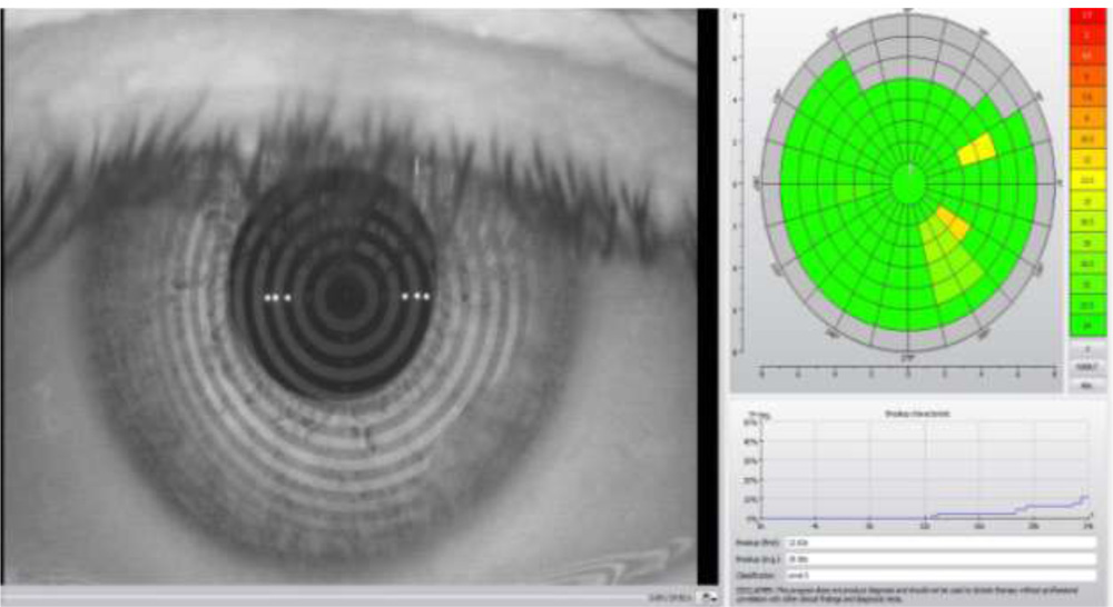 The time requiredfor the tear film to break up following a blink is calledTear Break UP Time(TBUT). It is a quantitative test for measurement of tearfilm stability2.We assessed theTBUT by noninvasive method with keratography 5 (Occulus).Its called Non Invasive Keratograph Break Up Time (NIKBUT).It uses a grid or other patterns directed on the precorneal tear film for observation of imagedistortion and time from opening the eyes to the first sign of image distortion is measured in seconds.Placido rings are reflected on the corneal surface. The software analyzes different segments and a distortion in the reflected mires is recorded as a break in the tear film. The results are displayed in a color-coded map, where red/orange segments correspond with a faster break-up time. A break-up characteristics map shows the total area (%) of the cornea affected during the measuring time. The time when the first break in the tear film occurred is displayed, as well as the average time of all the break-ups that occurred during the measurement. The software automatically grades the level .