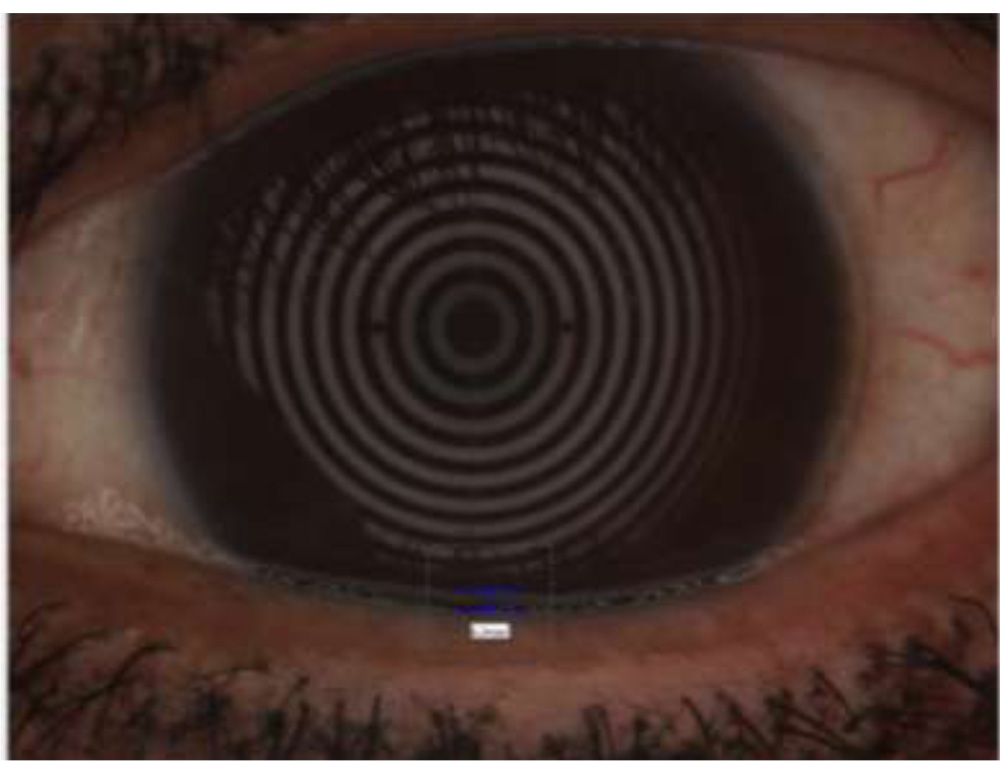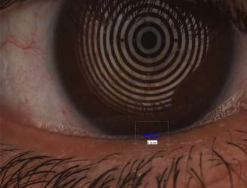 TMH assessment wasperformed by using the white light acquisition function in keratograph5.TMH measured with a built-in ruler. Generally, TMH is measured in line with the pupil center. Normal TMH > 0.20mm and Irregular TMH can be evaluated along the lid marginFig.3