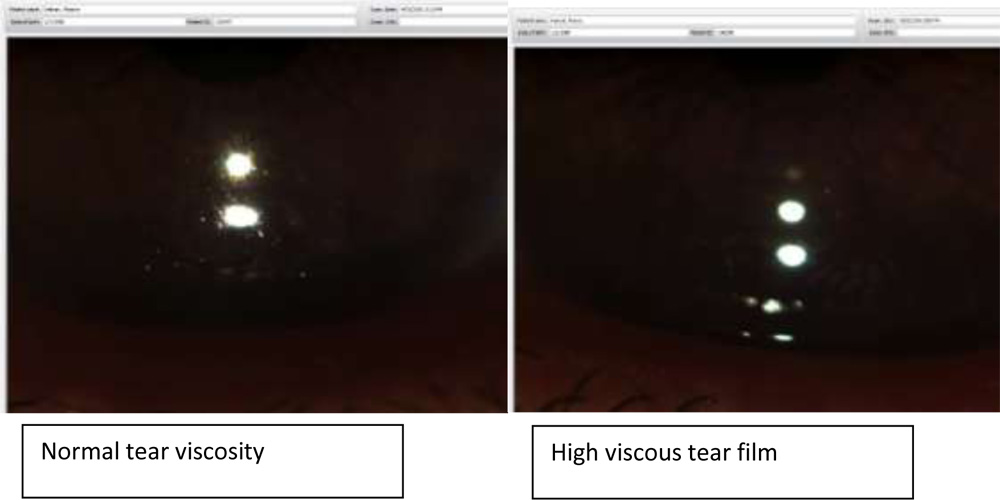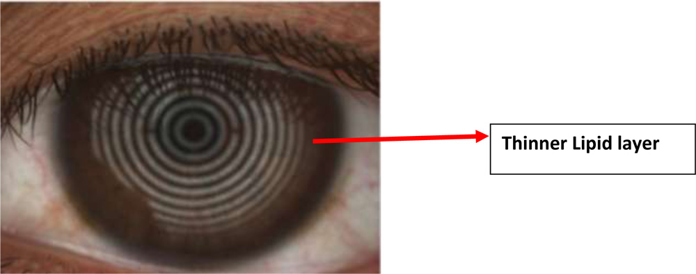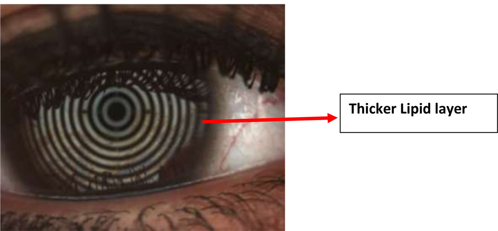 The quality of Lipid layer was assessed by keratograph5 .The principle of white light interferometry is used while a video or image is recorded.Instructed the patient to blink during recording . Recorded the lipid layer for the duration of two to three eyelid blinks .Thicker lipid layer are indicated by the bronze reflections withLots of colorful fringes .White, colorless reflections can be observed in patients with thin lipid layer.Fig4