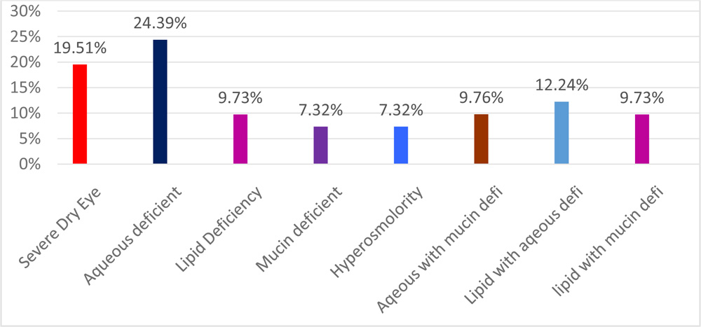 19.51% patients were affected by all components and are considered as dry eyes; 17.07% didn’t show dry eye ; 24.39% had aqueous; 9.73% lipid and 7.3% mucin deficiency ; 9.76% had mucin with aqueous; 12.24% had lipid with aqueous & 9.73% had lipid with mucin deficiency. Osmolarity was high in 50% aqueous deficient patients, in 100% lipid deficient & severe dry eye patients.