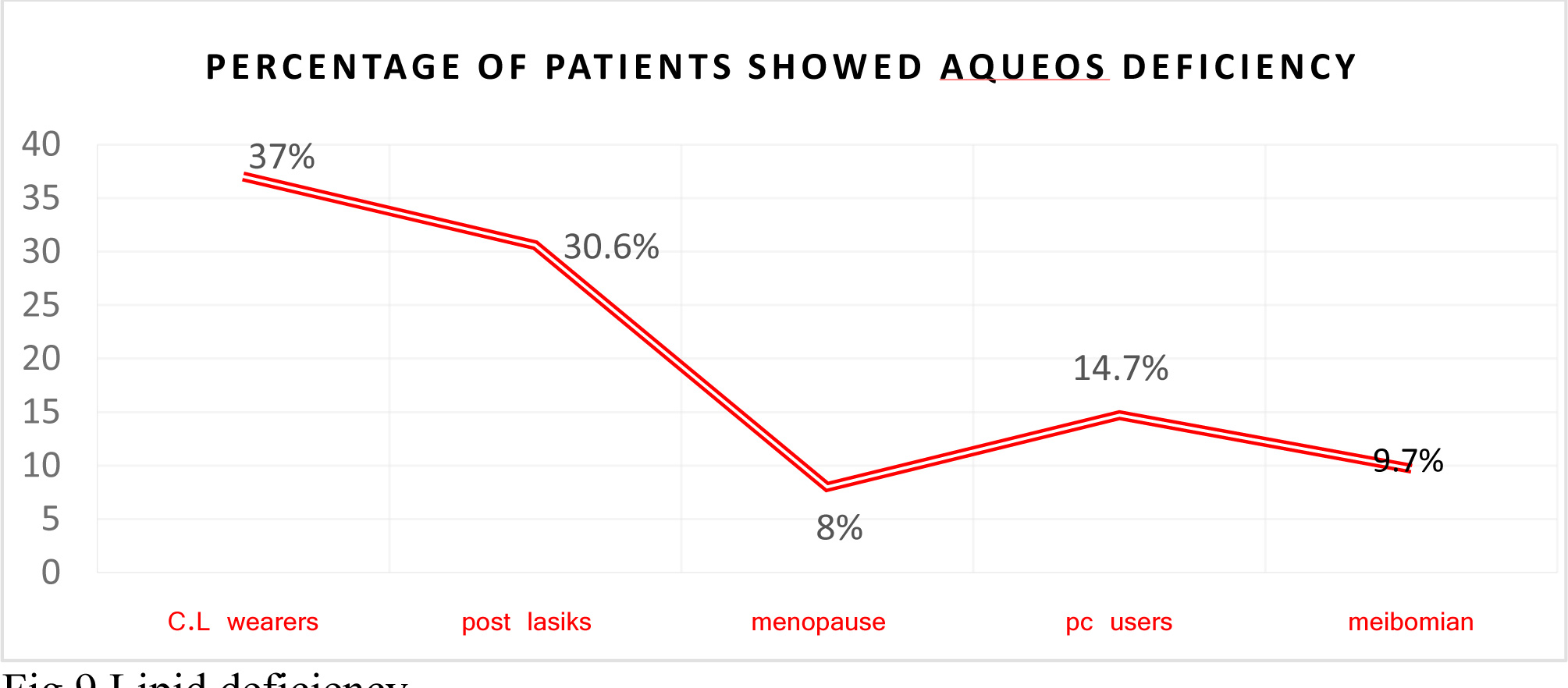 Aqueous component deficiency was more prevalent and is observed in post LASIK and contact lens wear patients. Fig.8. patients reached menopause and patients with Meibomian gland diseases (MGD)were more prone to had lipid deficiency Fig9.