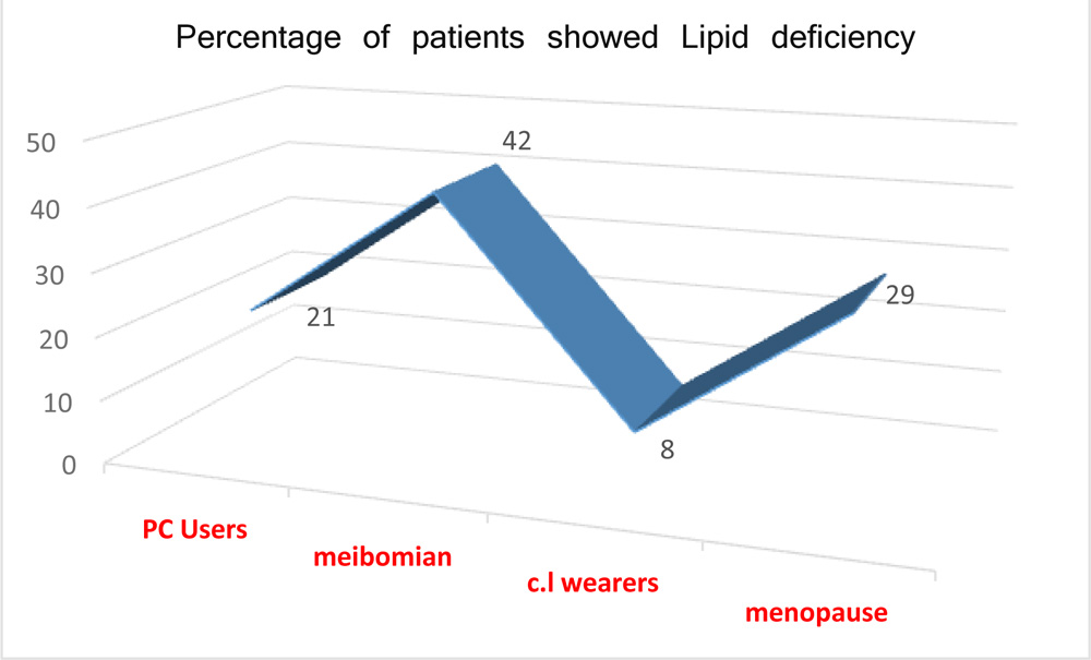 Results from our study showed that Meibomian gland dysfunction and menopause patients had higher lipid deficiency followed by PC users .Only 8% of contact lens wearers had lipid deficiency .