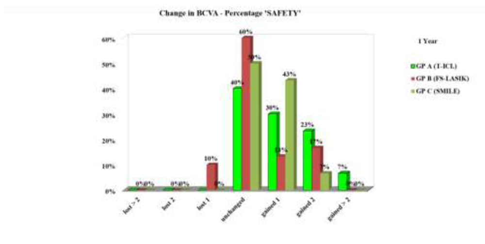 Safety (Post-operative CDVA/ Preoperative CDVA)– At 1 year, in the FS LASIK group, 4 eyes showed loss of CDVA by one line. T-ICLgroup, had the highest percentage of eyes(60%)  with  gain in lines of CDVA by one or more lines, compared to FS-LASIK(40%) and ReLEx SMILE group (50%)respectively. Correspondingly, the safety indices were 1.24, 1.15 and 1.11 in group A, C and B respectively(Fig 1).