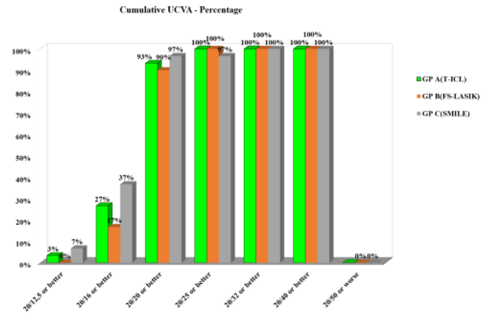 Efficacy (Post-operative UDVA/ Preoperative CDVA)–  At 1 year, 97% eyes in group-C (ReLEx SMILE), 93% eyes in T-ICL and 90 % eyes in FS-LASIK group had  UDVA of 20/20 or better(Fig 2). However, the efficacy index was highest in T-ICL group(1.12) compared to ReLEx SMILE(1.06) and FS- LASIK group(1.02).