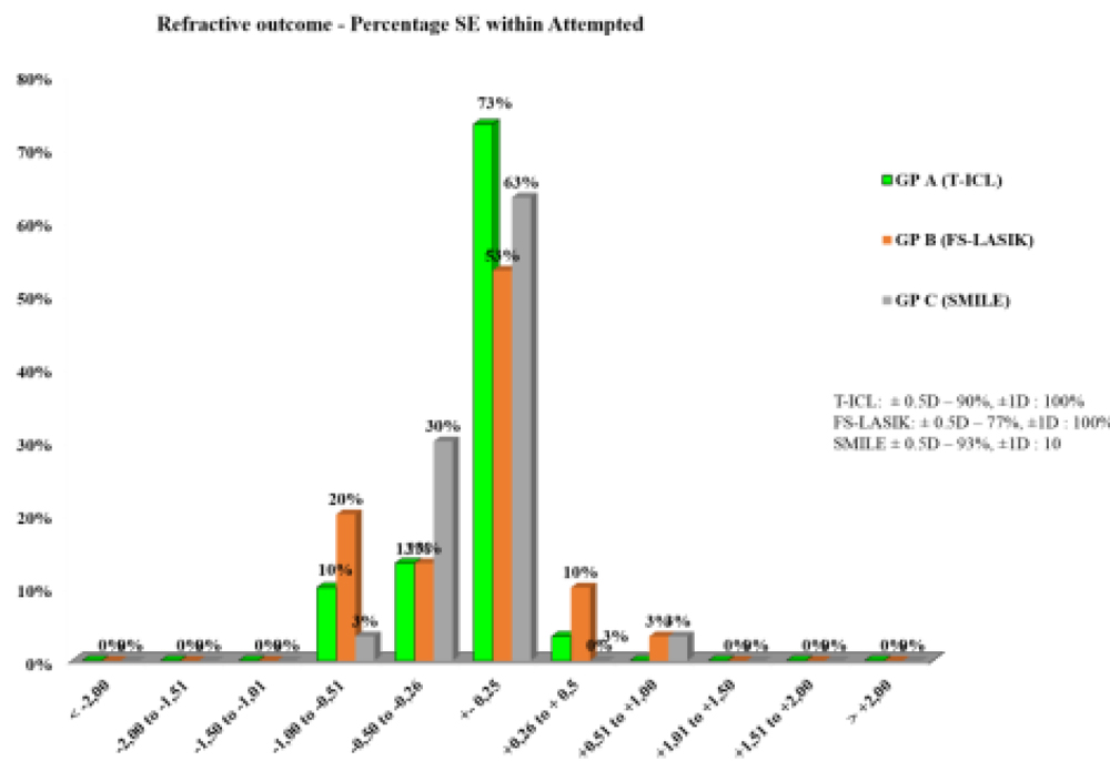 Comparable results were found with respect to SE correction in T-ICL and ReLEx SMILE group at 1 month post op. Mild undercorrection was observed in both Femto-LASIK and ReLEx SMILE groups, while the SE remained fairly stable in T- ICL group over time. However, differences between the groups were not significant at any follow-up visits(p<0.05)(Table 2).  SE predictability was within ± 0.5D in 93% eyes in ReLEx SMILE group compared to 90% eyes in T-ICL and 77% eyes in Femto-LASIK group. All 3 groups showed SE predictability within ± 1D in100% eyes. (Fig 3).