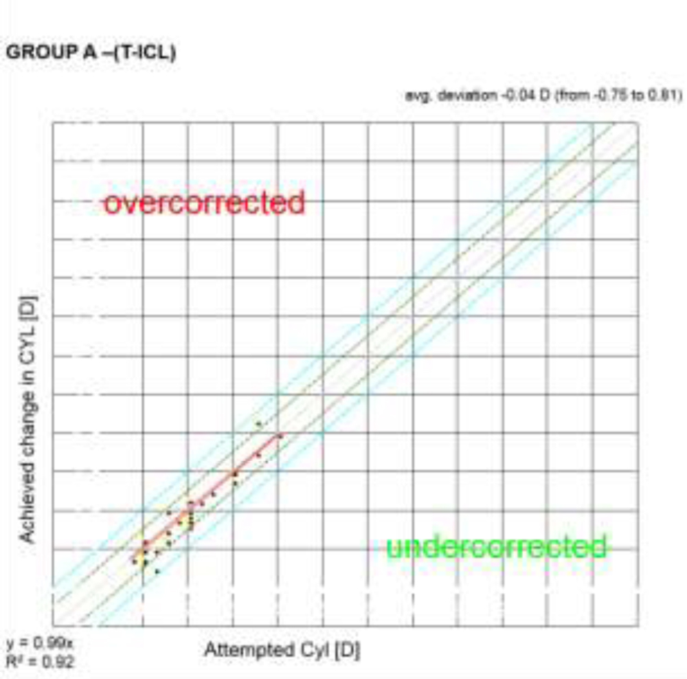 These results were consistent with the study by Hasegawa et al, who  reported a higher  predictability of  correction with FS-LASIK compared to  toric pIOL  in eyes with moderate  refractive cylinder(1.50 to 2.75 D), compared to high cylinder >3D, where toric pIOL was found to have better predictability.The authors speculated that this difference was due to  difference in the units of refractive cylinder correction since the refractive cylinder power of the Implantable Collamer Lens  (T-ICL) comes in 0.50 D increments, while, the corrective refractive cylinders used in LASIK are in 0.25 D steps (16).