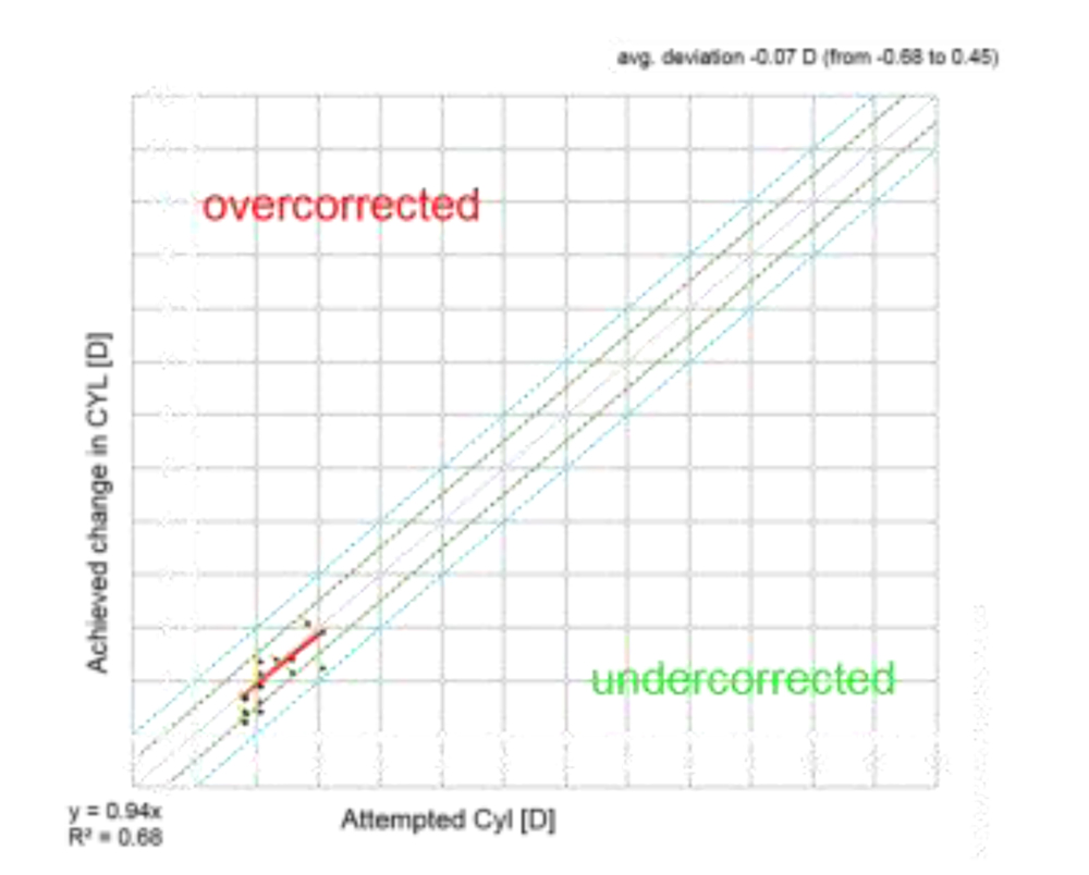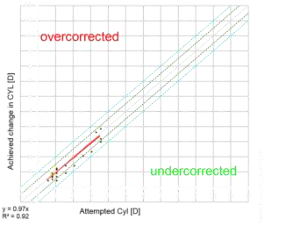 Figure4. Predictability- scatter (attempted v/s achieved) astigmatism correction with the three modalities at 1 year