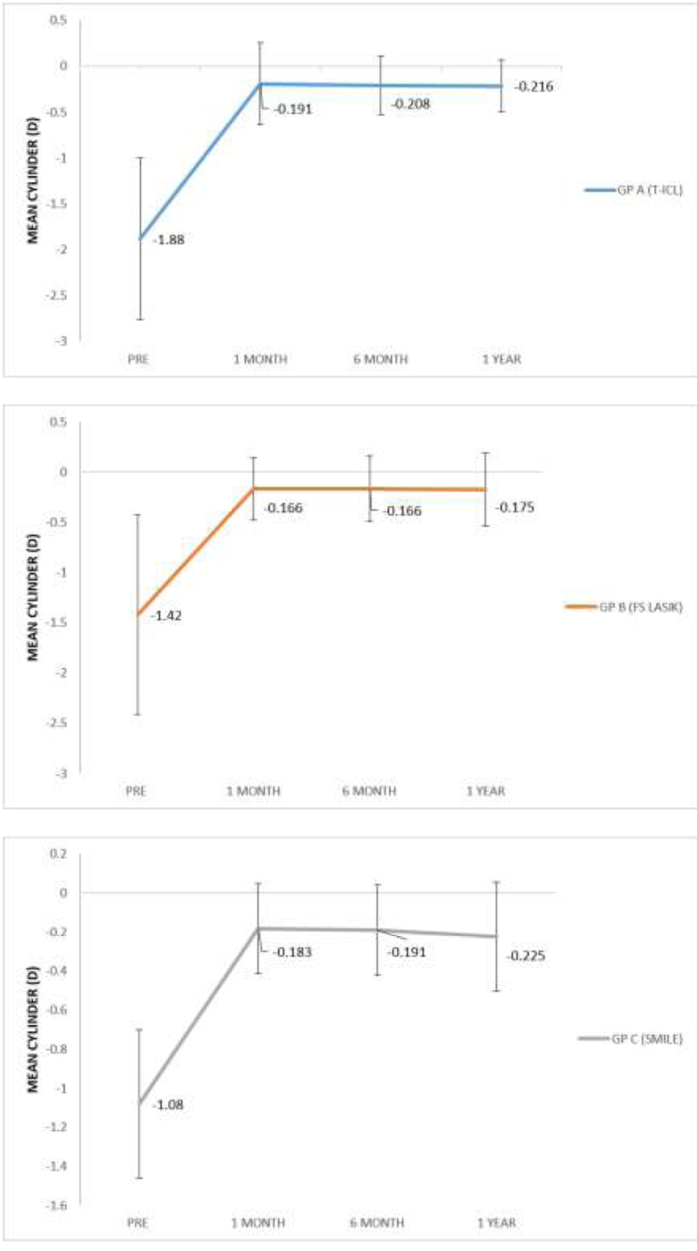 Predictability of astigmatic correction was slightly better with  FS-LASIK with 93% eyes being within  ± 0.5D at 1 year post-op compared to  T-ICL and ReLEx SMILE group (90% eyes within ± 0.5D for both groups). All eyes in all groups had cylinder predictability within ± 1D (Fig 4).All 3 groups showed a slight undercorrection of cylinder at 1 year, which was not statistically significant from 1 month values. (p<0.05)(Fig5)