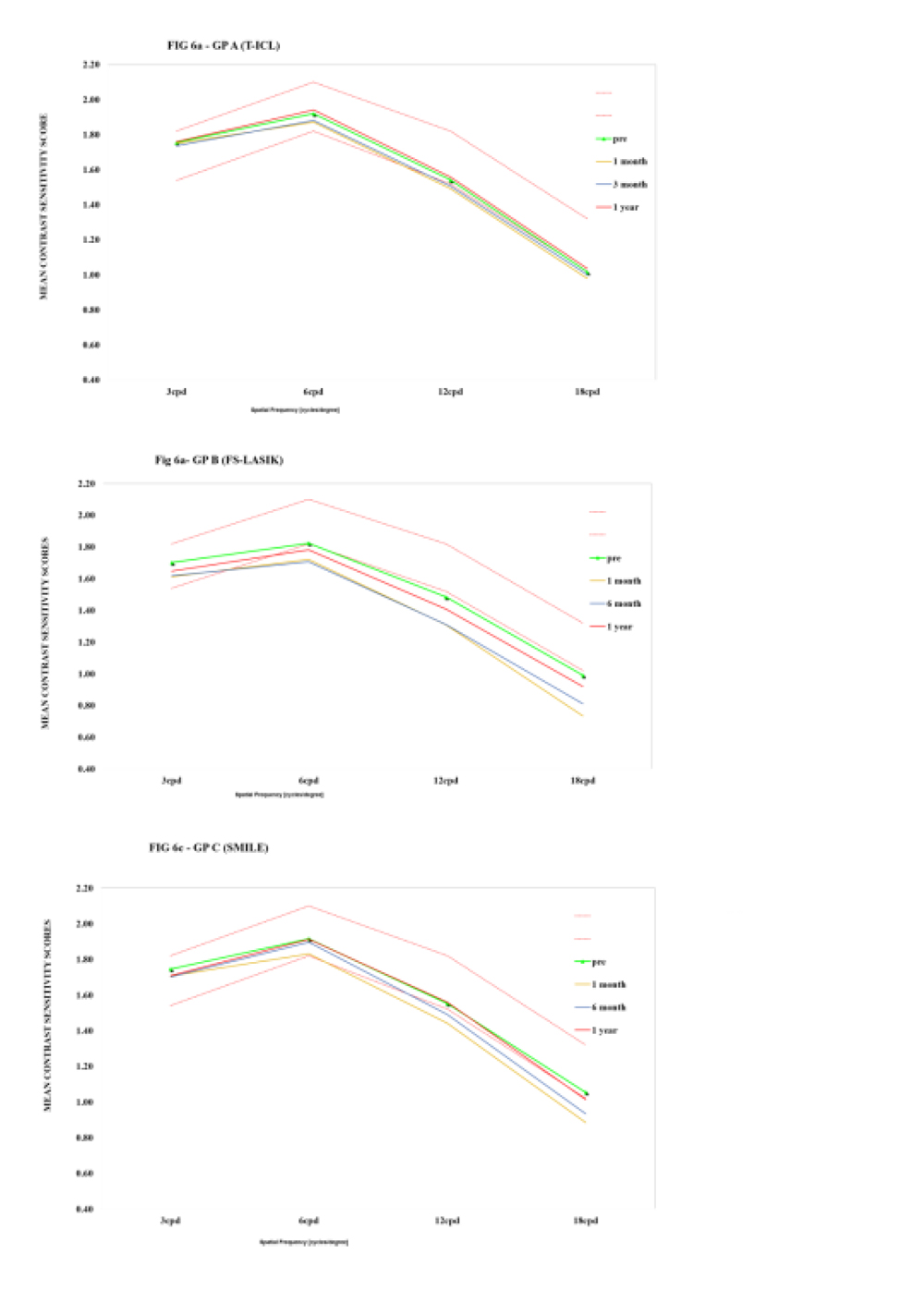 A significant improvement in higher order aberrations(HOAs)  in the T-ICL group was noted at 1 yr showed  ,which had actually reduced(p=0.007) ,  whereas in the FS-LASIK  group, the HOAs  had   significantly increased compared to pre-operative values(p=0.038). In the ReLEx SMILE group, HOAs marginally increased, but the difference was not statistically significant compared to pre-op values (p=0.68). (Table 3)