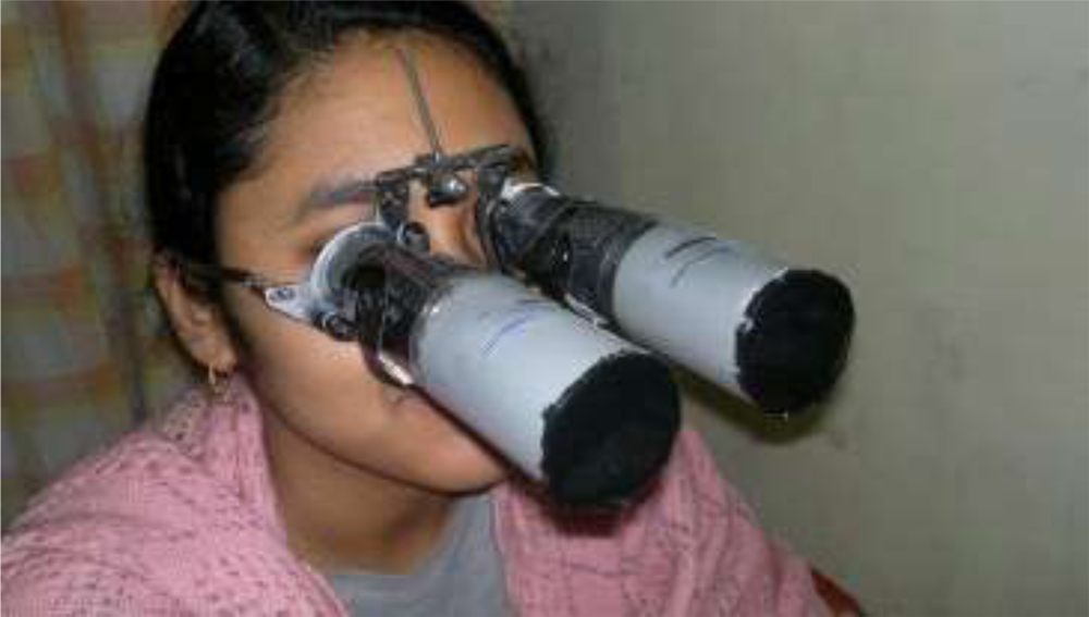 Occlusion therapy and patching of the good eye has been described for more than 200 years and remains the accepted treatment.1 Compliance is often a major problem because of the child’s dislike of occlusion owing to visual, skin irritation, psychological and social reasons prospectively. Orthoptic and pleoptic treatment of amblyopia2 have been maintained in Europe since 1950 using the principle that providing the amblyopic eye with the appropriate kind of visual stimulation or making specific functional demands on it, during the period of occlusion therapy, might accelerate the improvement in its vision. 3 Orthoptic treatment being institution based availability and compliance remains a problem. Any device for home orthoptics may be helpful. Trial frame and toy Bioscope/binoculars can be used to design such instrument. Innovation consists of seeing what everybody has seen and thinking what nobody has thought.