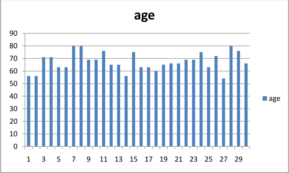 30 eyes of 20 patients were analysed. 14(46.7%) eyes belonged to males and 16(53.4%) females. The range of age of the patients belonging was 54 to 80 years as shown in table 1 Mean age was 67.4 years with SD (standard deviation) of 7.16.