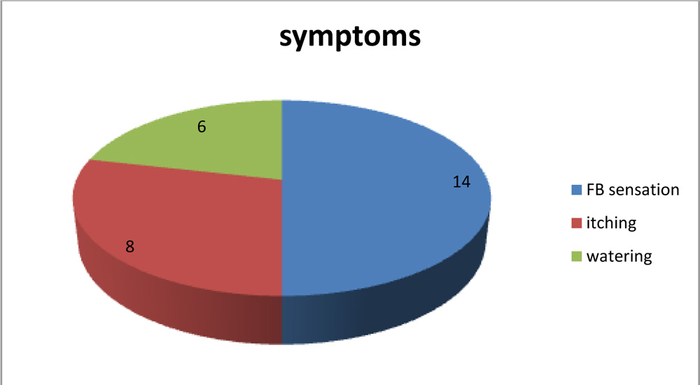 The most common ocular complaints of the patients were foreign body sensation (14 eyes) accounting for 46.7%, followed by itching and watering.(8 eyes- 26.7% and 6 eyes-20% respectively) as shown in table 2.