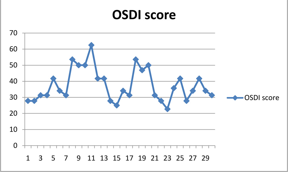 14(46.7%) eyes didn’t have any systemic association followed by diabetes mellitus being the most common (7 eyes) followed by bronchial asthma(3 eyes) hypertension(2 eyes) and cardiac disease(2 eyes). Dry eye questionnaire asked using OSDI had scores ranging from 22.7 to 62.5 as shown in table 3.The mean score was 37.39, median 34.1 and mode value of 31.3.