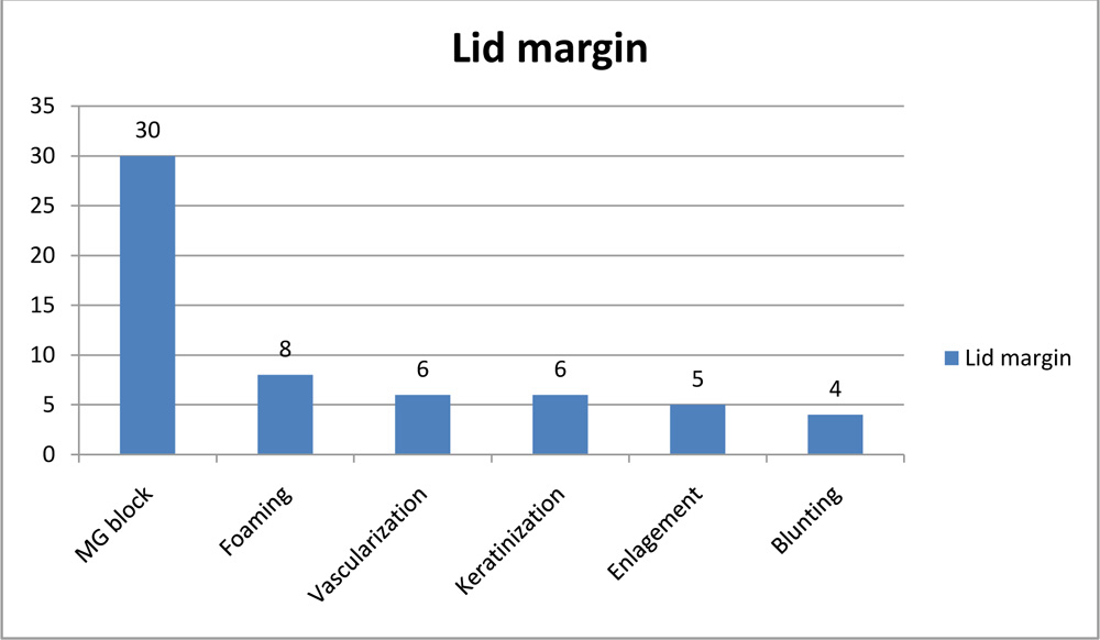 On lid margin examination via slit lamp noted MG block in all the eyes, followed by foaming seen on lid margin (8 eyes) flowed by lid margin vascularization(6 eyes) and keratinization (6 eyes).5 eyes were noted to have enlarged lid margin and 4 eyes had blunting of posterior lid margin as demonstrated in table 4.