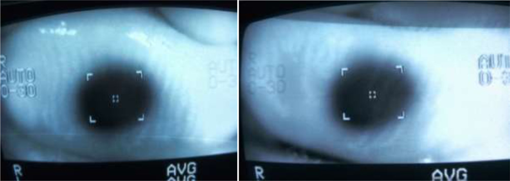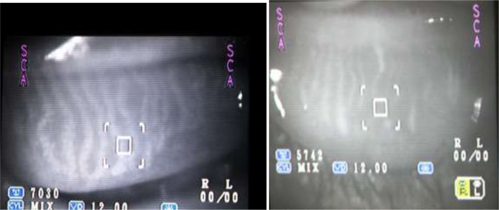 We tried to visualize the MGs by the infra red imaging using autorefractomer (Topcon RM8900), non contact tonometer (CT 80 Topcon), fundus camera (Zeiss), Zeiss  IOL master 500, specular miscroscope ( Topcon SP-3000p), ATLAS 9000 topographer and Visante AS-OCT which we have in our hospital. The images obtained were good enough to visualize the morphological features of MGs in these MGD eyes. We noted gland tortousity, shortening of the glands, broadening of the glands and gland drop-outs to various extent in many eyes. The images obtained by autorefractometer, IOL master, specular microscope, fundus camera, corneal topographer and Visante AS-OCT were better than those obtained by non-contact tonometer (NCT). The central shadowing of NCT while noting the MGs obscures the full visualization of MGs. The sample images obtained from these above mentioned instruments are as follows:
