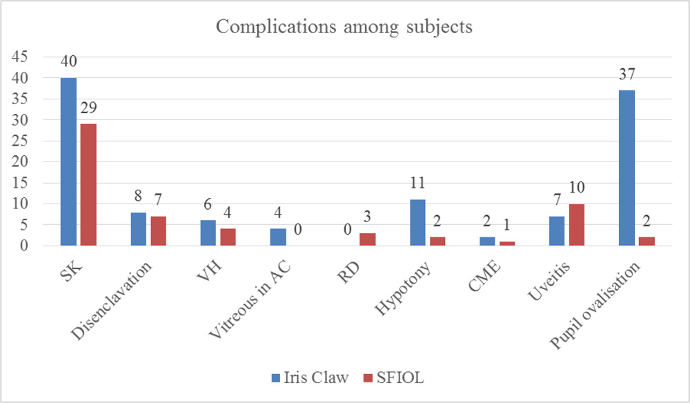 Complications- Striate keratopathy and Pupil ovalisation were the most common complications among Iris claw group. In SFIOL group,striate keratopathy and Uveitis were the most common complications. Vitreous in Anterior chamber (Group I n=4, Group S n=0) (p value 0.043), hypotony (Group I n=11, Group S n=2) and pupil ovalisation (Group I n=37, Group S n=2) were thus significantly higher in the Iris claw group. There were other complications seen in both groups such as disenclavation (subluxation in cases of SFIOL), Vitreous haemorrhage, cystoid macular edema but the difference between the two groups was not significant. Retinal detachment was seen in 3 eyes that underwent SFIOL.