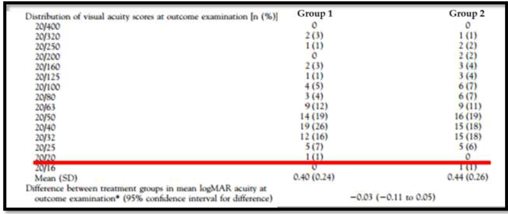 Figure 1: Showing the residual amblyopia after 6 hours/day patching (group 1) and full time patching (group 2) in anisometropic amblyopia as reported in ATS 2A of PEDIG.