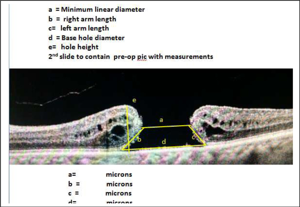 - Macular hole minimum linear diameter (MLD) – Minimal horizontal extent of the hole (Measurement b- Fig 1)