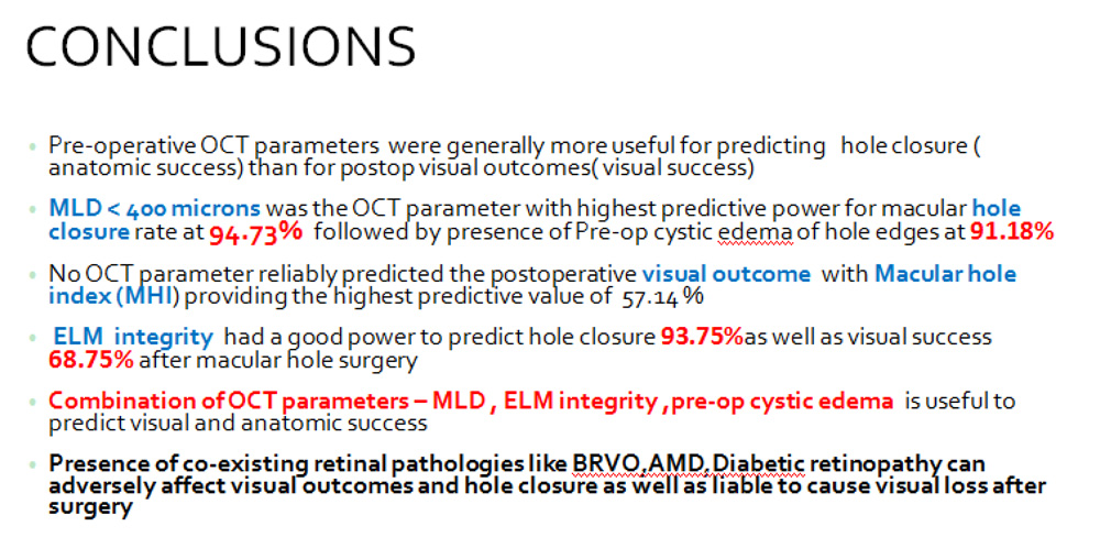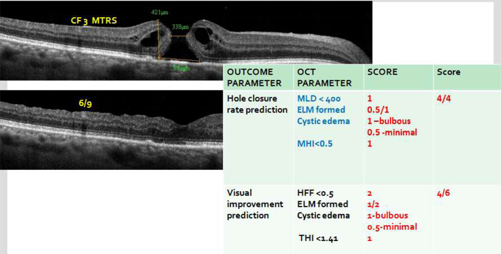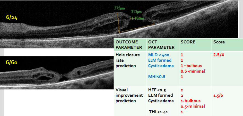 Based on a detailed , multiple logistic regression analysis of various OCT parameters in 44 cases of macular hole surgery,we found that using multiple OCT indices and parameters in unision is the only way to reliably predict outcomes .Using MLD( Minimum linear diameter),ELM integrity , grading the cystic edema of hole edges , MHI ( Macular hole index) ,HFF ( Hole form factor) & THI (Tractional hole index) ,we present a nomogram to reliably predict both anatomical and visual outcomes .To avoid time spent on manual calculations of OCT indices , this online nomogram does all calculations and gives a numerical score for hole closure & visual success .
